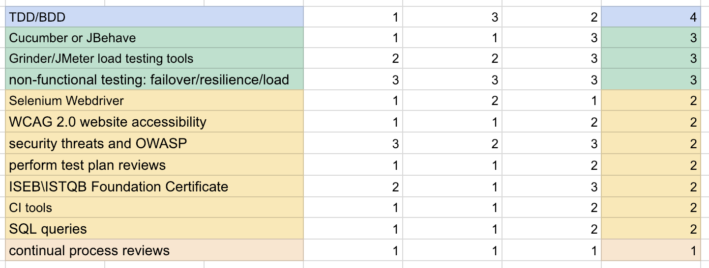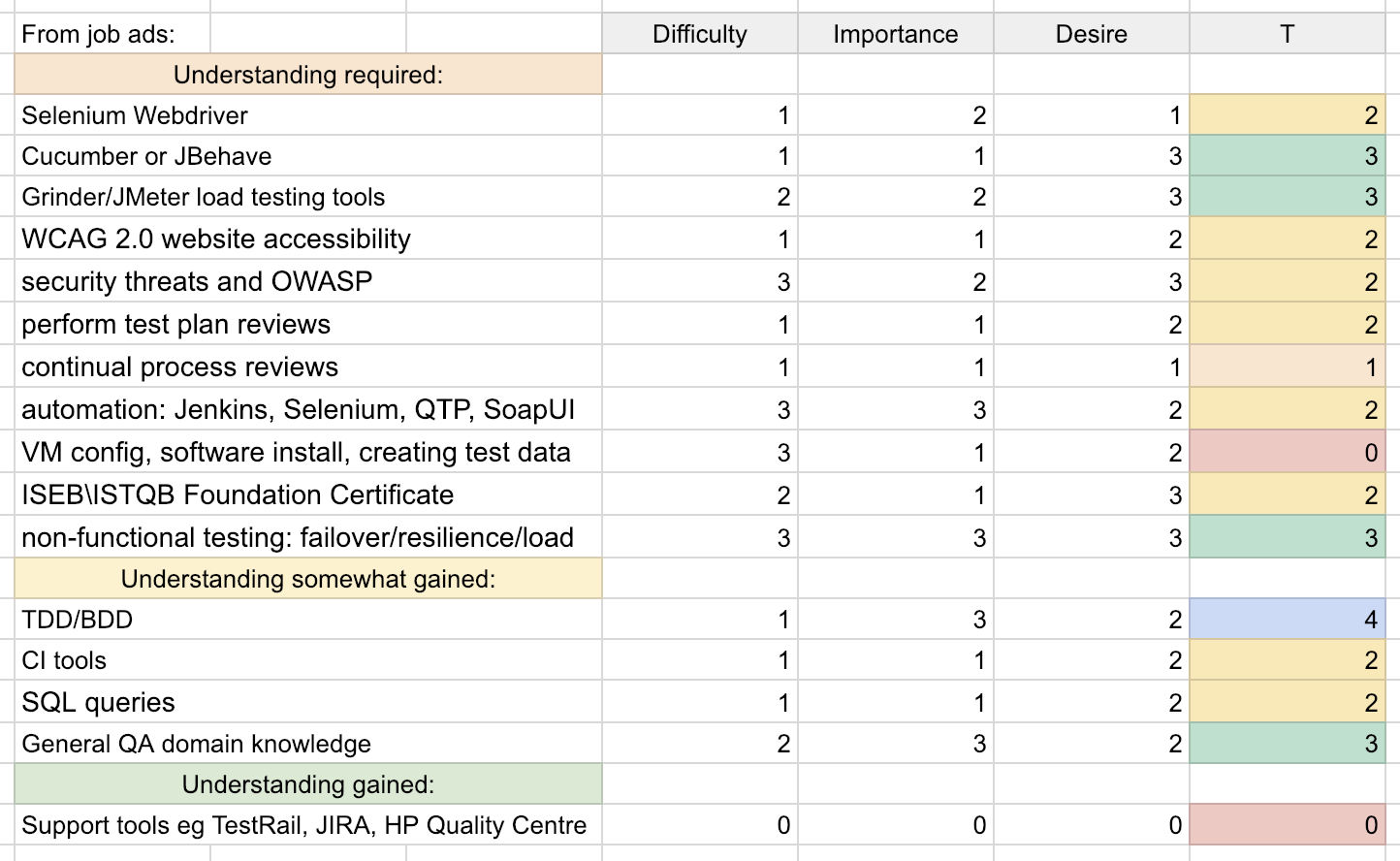 After this, I needed a way of grading which would show which skills I should work on first. Obviously, things that score highly on Importance and Desire should be up there. I also decided that things with a higher Difficulty rating should be penalised, since every QA article I’ve ever read says to start with the easy tasks and work your way up. Keeping it simple, I came up with the short formula: