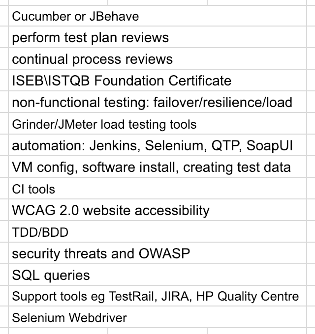 I decided to look for tester-specific skills online, and found the easiest way of doing this was to look at the requirements in job adverts. I’ve added a few examples below of what came up on the first page or two of a search for “Lead QA” positions, which would be a step up from my current position as Junior QA (we unofficially ditched the ‘junior’ part after 6 months, but it’s still what it says on the contract so I’ll stick with it because I’m Lawful Good).