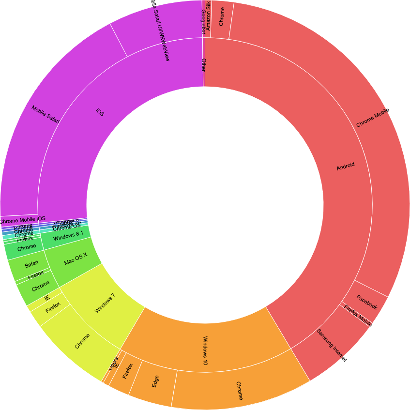 We didn’t have this exact information at the time, since this data comes from me querying our analytics database since the meeting, to decide which browsers and devices we should test with. I downloaded the query results as a csv file, then used Rawgraphs to create the graphical representation. I’m not a cool data scientist person, so no special cool charts for you, just a barely legible donut with atrocious colour choices.