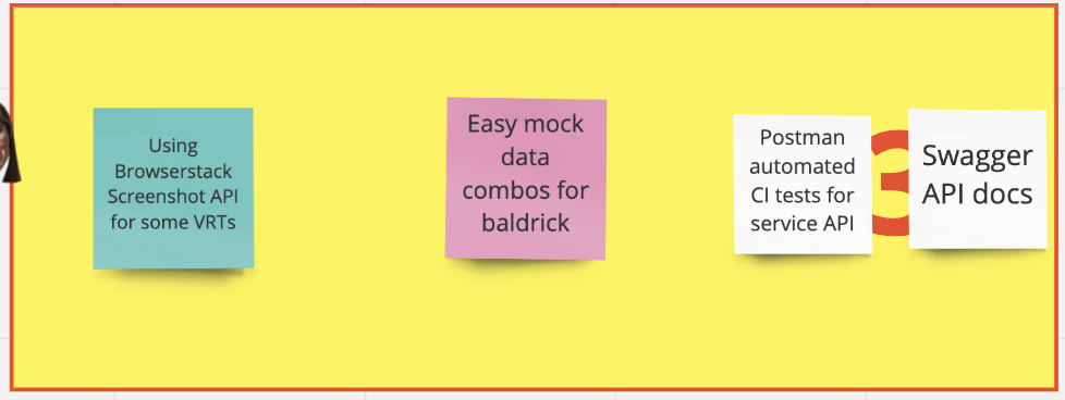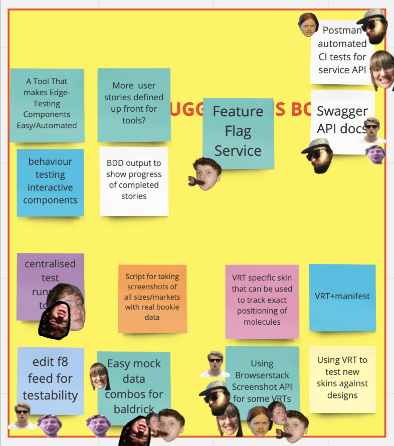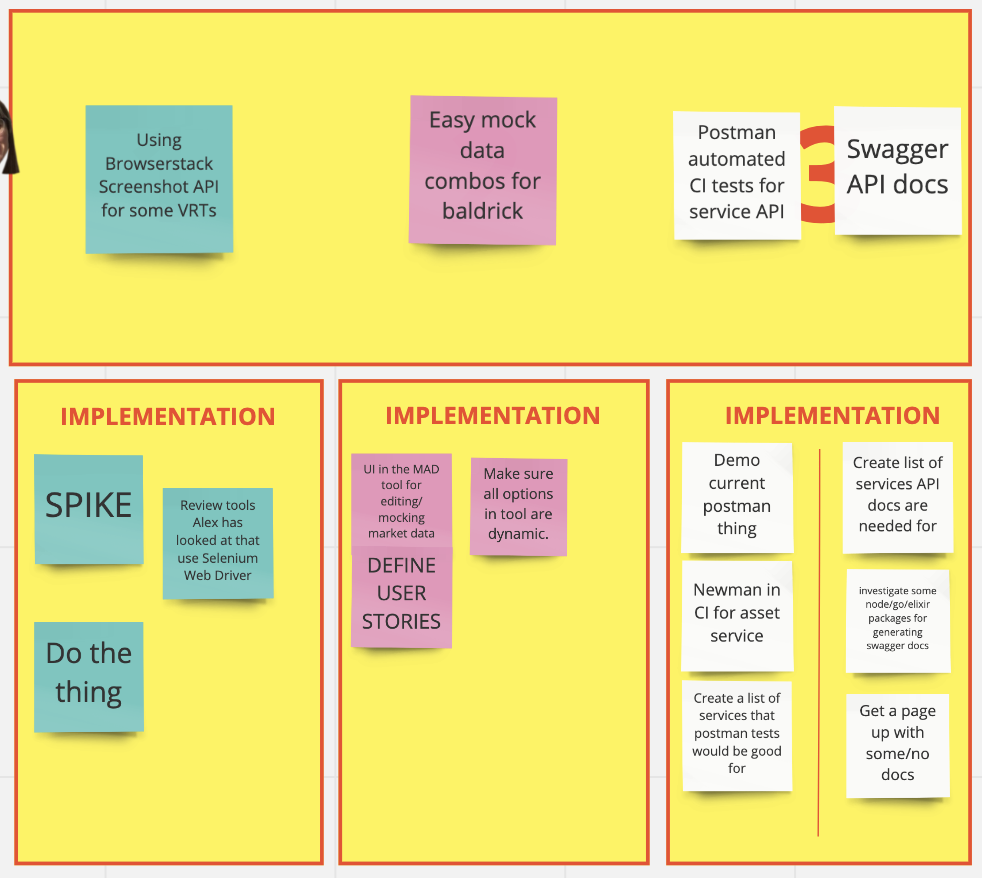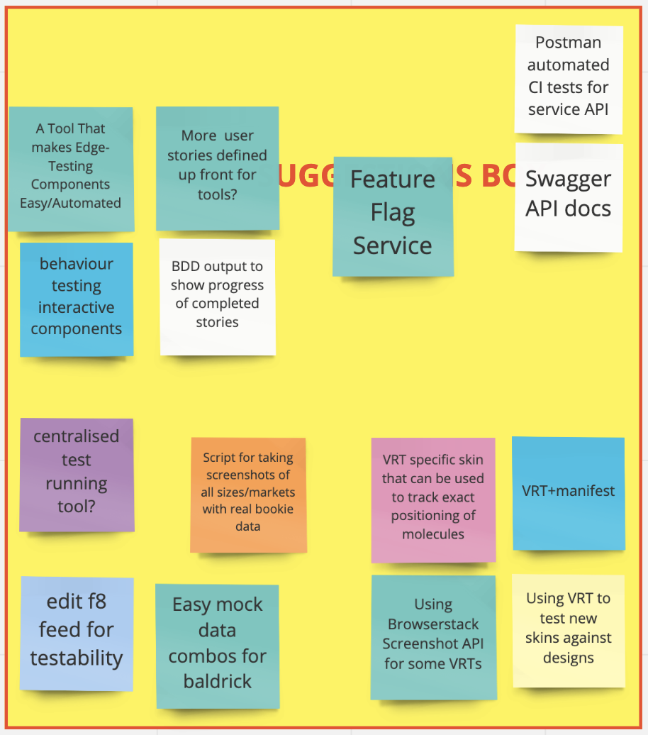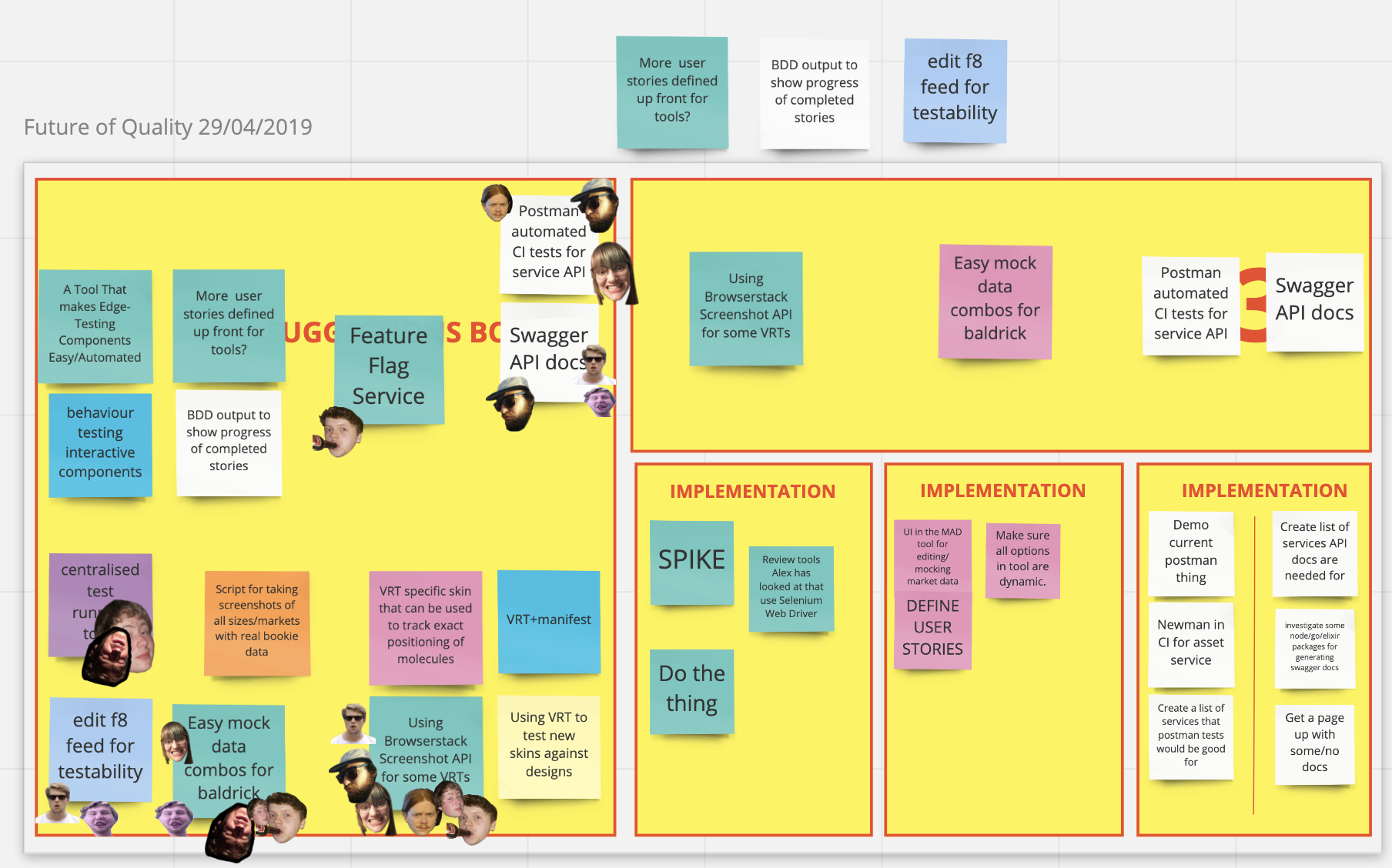 Top left was behaviour related things, top right API testing, bottom right tasks around the Visual Regression Tests, bottom left was mock data for test and dev. Then there’s some misc ones, eg a centralised testing tool and feature flagging.