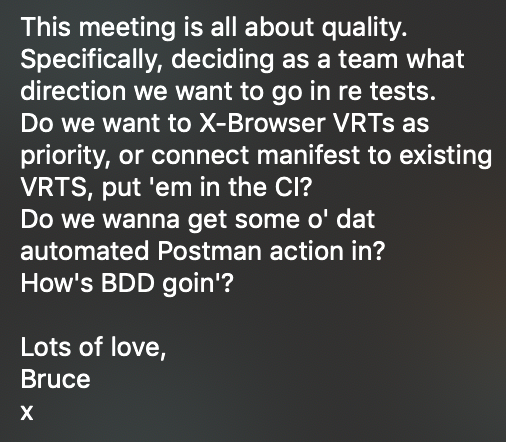 The first part is an open suggestions box – what should we be working on re testing and general quality things? Tool suggestions, areas we should be covering more. The format is based loosely on the idea of a lean coffee, where a bunch of ideas are suggested and described briefly, and then everyone votes on the issues we want to talk about more. To ensure that we kept within the one hour time limit, I then created a section for the top three ideas. Not the top five if some get similar vote counts, not the top ten because we just can’t not talk about them all… The top three, end of. I can be pretty harsh, I guess. I was also pretty heartless in cutting discussions that were getting out of hand, going too far into implementation details for things we hadn’t decided whether we wanted to do or not yet.