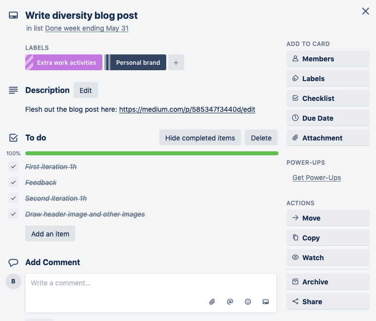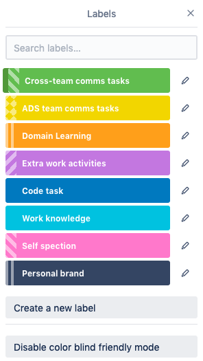Work knowledge is a weird one, and I might change the name if I think of one that better reflects its use. It has some cross-over with other labels, so might drop into obscurity over time anyway (you can add multiple labels to cards though). It’s similar to domain learning, but instead of high-level topics this is concerned with information that is specifically useful to my job at Fresh8. For example, I am often underprepared for our mini-refinement sessions after stand-up every morning, so I can’t always suggest ways of mitigating risk in those pieces of work. Therefore, I have added a task for setting aside time at the end of every day to read through at the tickets that will be refined the next morning and think about or research them.