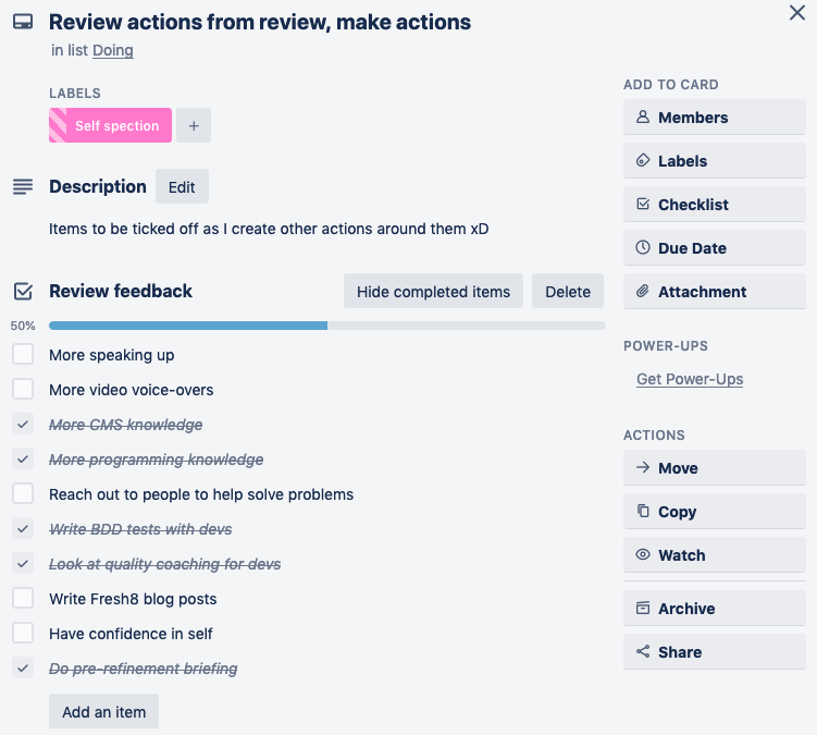 For this task, I’ve taken the suggestions for improvement anonymously given to my manager for my one year review, and put them into a tickbox list. When I think of one or more actions I could take to improve on a list item, I add a card for it to the backlog and then tick off the item on this list. I’m not sure what action I could take to have more confidence in myself though, and I don’t think I want to add writing more Fresh8 blog posts to my list of responsibilities when I already have a personal blog that I struggle to keep updated. Having said that, my brain is just chock full of ideas all the blinkin’ time, and it just takes a suggestion of a job and I’ve thought of a million ways I could be doing it so nicely.