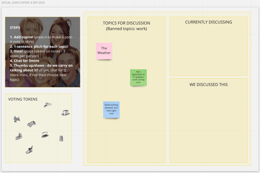 Basically, you all suggest topics you want to chat about and then vote on them to create an ordered backlog of topics. Then you start with the subject that has the most votes, talk about it for a specific and strict amount of time, then vote on whether or not you’d like to continue talking about it as a group. That stops individuals from going on and on and on, with everyone feeling too awkward to stop them or use their own voices. You move through the topics until you run out of time!