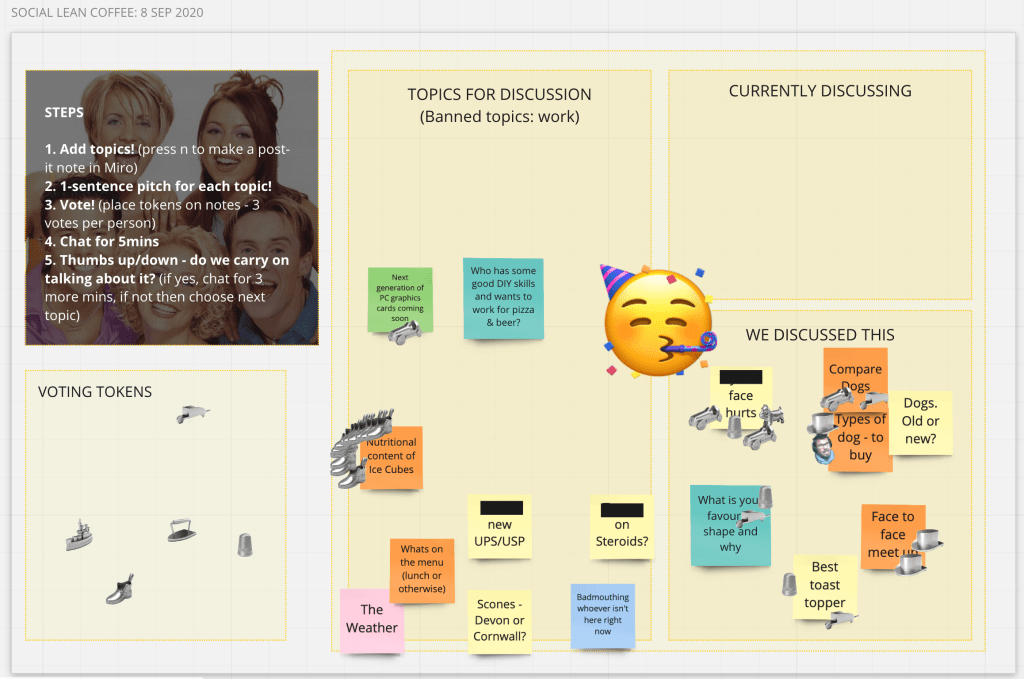 It was great fun both facilitating and taking part in the social lean coffee. Having a virtual board with an activity on it as a common point of interaction stopped people from going afk during the call, and encouraged the lurking humans to come out and take part in the discussion. The lean coffee definitely succeeded in getting everyone chatting and learning about each other in a way the social calls haven’t done in the past.
